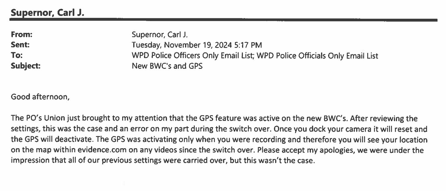 Related, my petition following the thread of the responding officers not having body worn cameras passed, after I received this showing that the police union had initiated the docking of police cameras