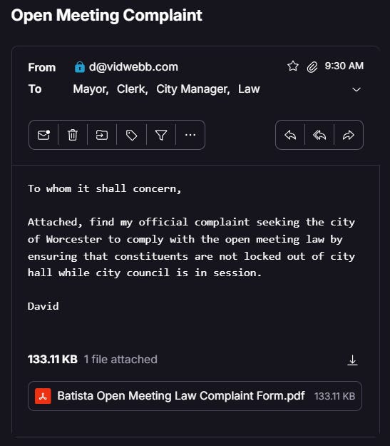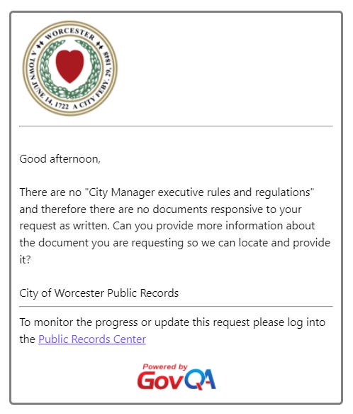 I managed to use our city manager's deceptive remarks after my attack in conjunction with a response from the head clerk to create a well laid out argument that our city manager is responsible for open meeting law violations, which they're gonna have to discuss among themselves, fix, and then tell me and the state how they fixed it. This will get it's own post too.