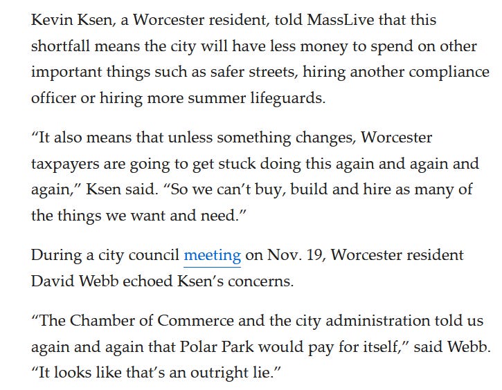 Mass Live quoted me saying “The chamber of commerce and city administration told us again and again that Polar Park would pay for itself. It looks like that’s an outright lie”.