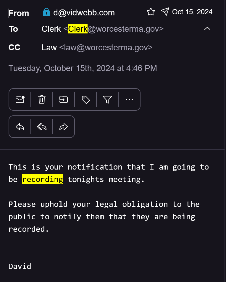 Now, before we go further, I want to briefly touch on Massachusetts recording laws, which is easy because there are none - what is relevant are wiretapping laws, which prohibit secret audio recording. So long as it’s not SECRET it’s legal.