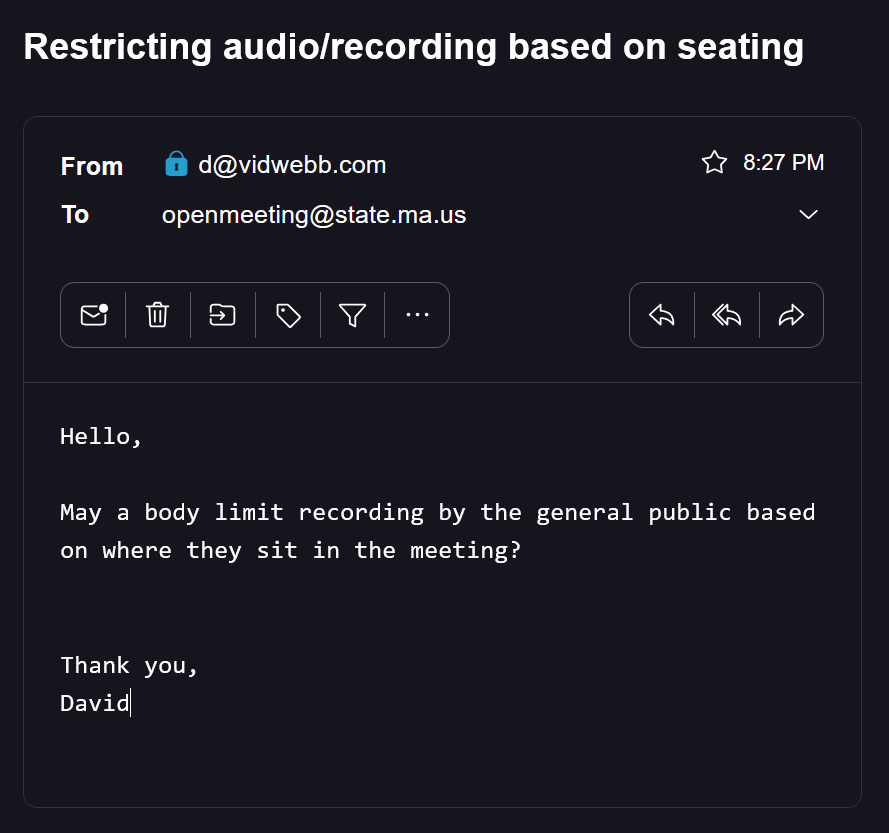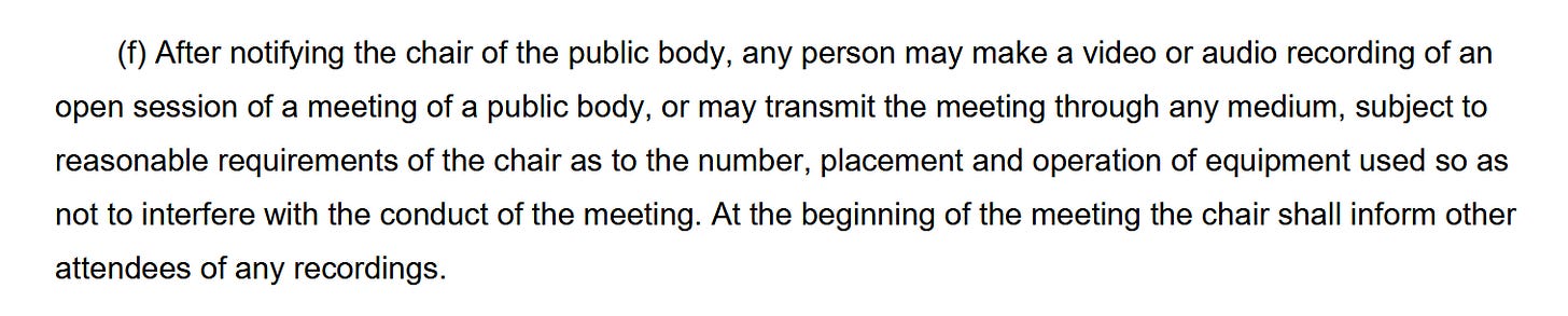 Public meetings, like city council, are even more clear cut, here’s the full section of that part of the Open Meeting law
