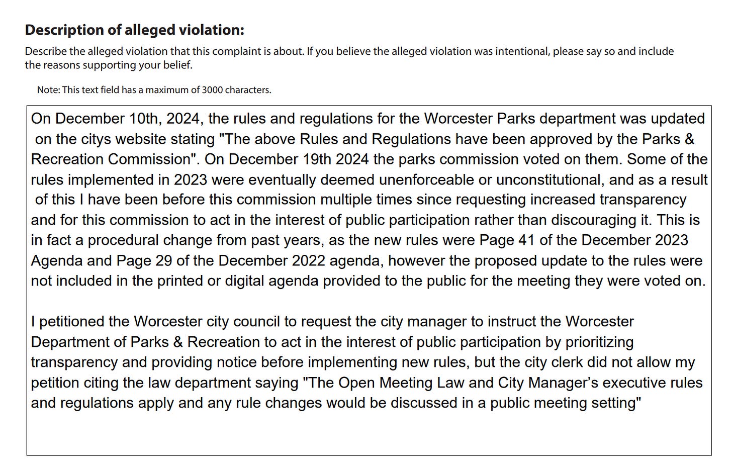 Playback speed×Share postShare post at current timeShare from 0:000:00/0:00TranscriptThe Parks Commission addresses my complaintWith a brief explanation before the meetingDavid WebbJan 24, 2025ShareTranscriptThey didn’t try to go into executive session, and two commissioners spoke in support of my activism and participation at these meetings.For reference, this is the complaintDiscussion about this videoCommentsRestacksWhat Could Possibly Go Wrong?SubscribeAuthorsDavid WebbRecent PostsGood Trouble, Protest Safety, Police IdeologyAug 13 • David WebbTuesday Update 6-10-25Jun 10 • David WebbTuesday City PreviewJun 3 • David WebbWorcester City Hall Brute Squad on duty early?May 21 • David WebbWebb State Of the City AddressMay 21 • David WebbDiscussing Conduct of City OfficialsMar 5 • David WebbLaurel Clayton Neighborhood Historic Deep DiveFeb 23 • David WebbBadges at the Bus station?Feb 22 • David Webb